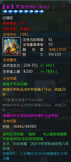 《仙侠世界》8星法宝紫金铃铛,法术攻击力:234—351,生命上限:8200,法宝技能:金身不坏诀。融合度:无双。