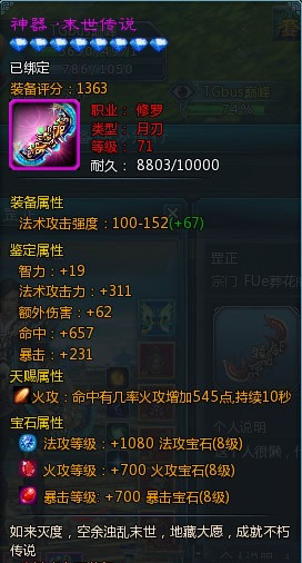 《仙侠世界》神器.末日传说,71级修罗刀刃,法术攻击强度100—150。智力+19、法术攻击力+311、额外伤害+62、命中+657、暴击+231。天赐属性火攻:命中有几率火攻增加545,持续10秒。装备还打上了三颗8级宝石。——如来灭度。空余浊乱末日,地藏大愿,成就不朽传说。