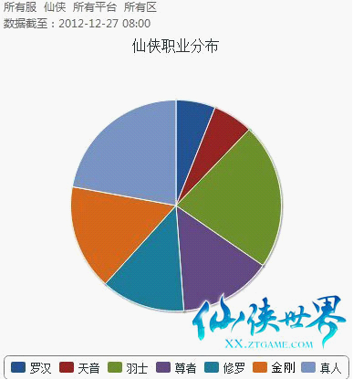 《仙侠世界》**有7大职业,分别是金刚、羽士、真人、尊者、罗汉、修罗、**。根据仙侠世界截止到12月27日的运营数据来看,目前游戏内所有服务器中,关于玩家职业的分布显示,最热门的职业为真人和羽士。看来,选择高输出的DPS玩家心目中都住着一个道法高深的仙人。仅随两大DPS后,修罗、金刚、尊者三大职业平分秋色,其中罗汉仅是为男性选择的职业,而**仅是为女性选择的职业,这两大职业从数据中看稍居落后,但在游戏内,撞见选择这两大职业的玩家几率还是非常高的。