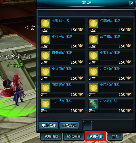 只能带法攻玄兽却喜欢物攻玄兽的外观?全新玄兽外观幻化功能登场,只需两步,就可把玄兽变成你最喜欢的样子,打造个性玄兽!第一步,找到凌霄城NPC“小浣熊”,选择“玄兽幻化”分页,在这里你将看到所有玄兽可以幻化的外型,购买你想要的玄兽外观。图片1:玄兽幻化道具一览第二步,对你想要改变外