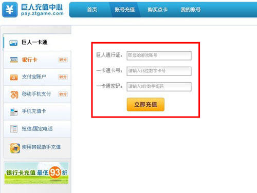 玩家在巨人网络官方网站(http://www.ztgame.com/)输入自己的帐号和密码登入后,进入充值中心,通过“一卡通充值”或者“银行卡充值”为自己的帐号角色进行充值。
