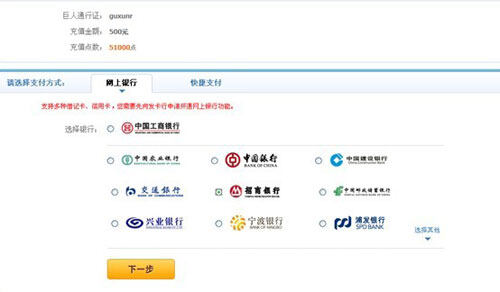 如上图所示,选定银行卡后,点击“下一步”,按照提示确认订单,支付完成后,即充值成功。除了以上两种,玩家还可以通过支付宝帐户、移动手机支付、手机充值卡、短信/固定电话、使用网银助手充值这五种方式来进行充值。