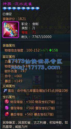 下面为大家带来《仙侠世界》金刚极品武器。71级紫色刀——神器沉水龙雀。该装备附加天赐属性,各项属性非常的养眼。