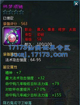 《仙侠世界》5鉴定属性怀梦项链。双减对方法力值224,这要是PK很强大啊,蓝很快就没有了。最大法术攻击强度+32。