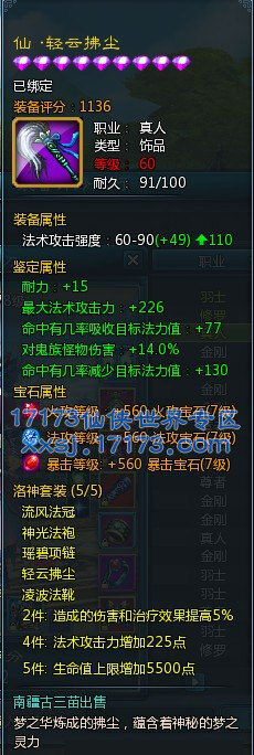 《仙侠世界》9星装备非常的罕见。因为神器一共才8星。自从上次爆料了9星项链后,又一个9星装备出世。该装备为60就真人项链。稀罕的5条鉴定属性。法功+226,双吸蓝+207.超极品啊!